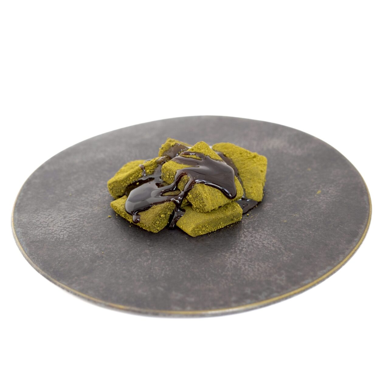 抹茶ときな粉たっぷりのわらびもちに、波照間島産黒糖の自家製黒蜜をお好みでかけてお召し上がりください。