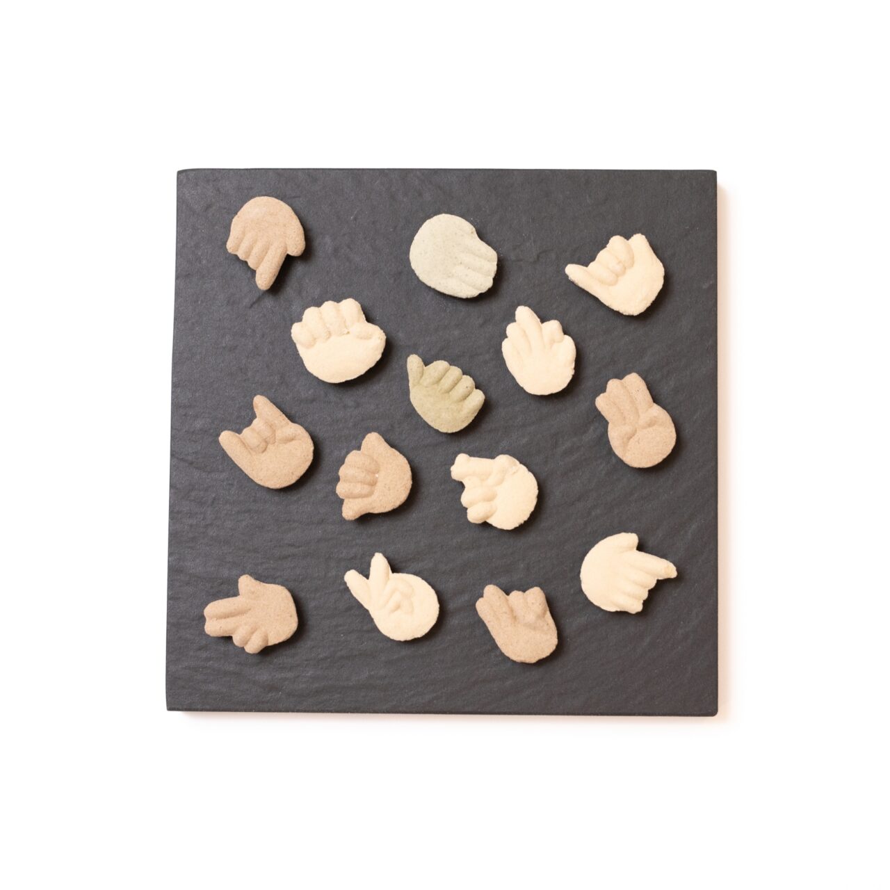 昨年、「親子で楽しむ 横浜美術館 手話によるご案内(日本語字幕・音声ガイド付き)」に出演させていただいたご縁から、このたび〈指文字落雁〉をお取り扱いいただくことになりました。
